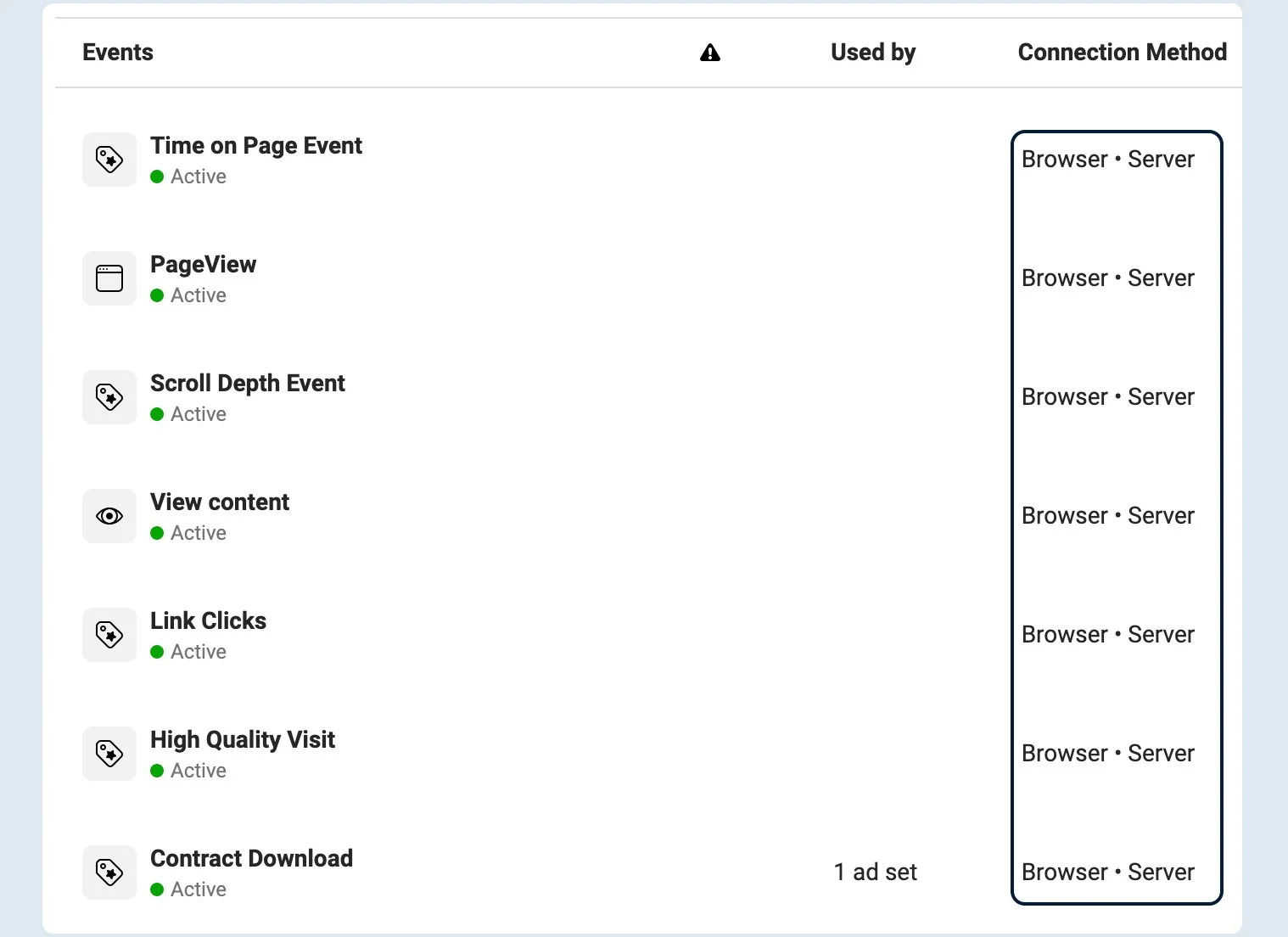 Потім знову перейдіть до Менеджера подій та виберіть піксель як джерело події. У стовпці «Спосіб підключення» має бути включено як Браузер, так і Сервер.