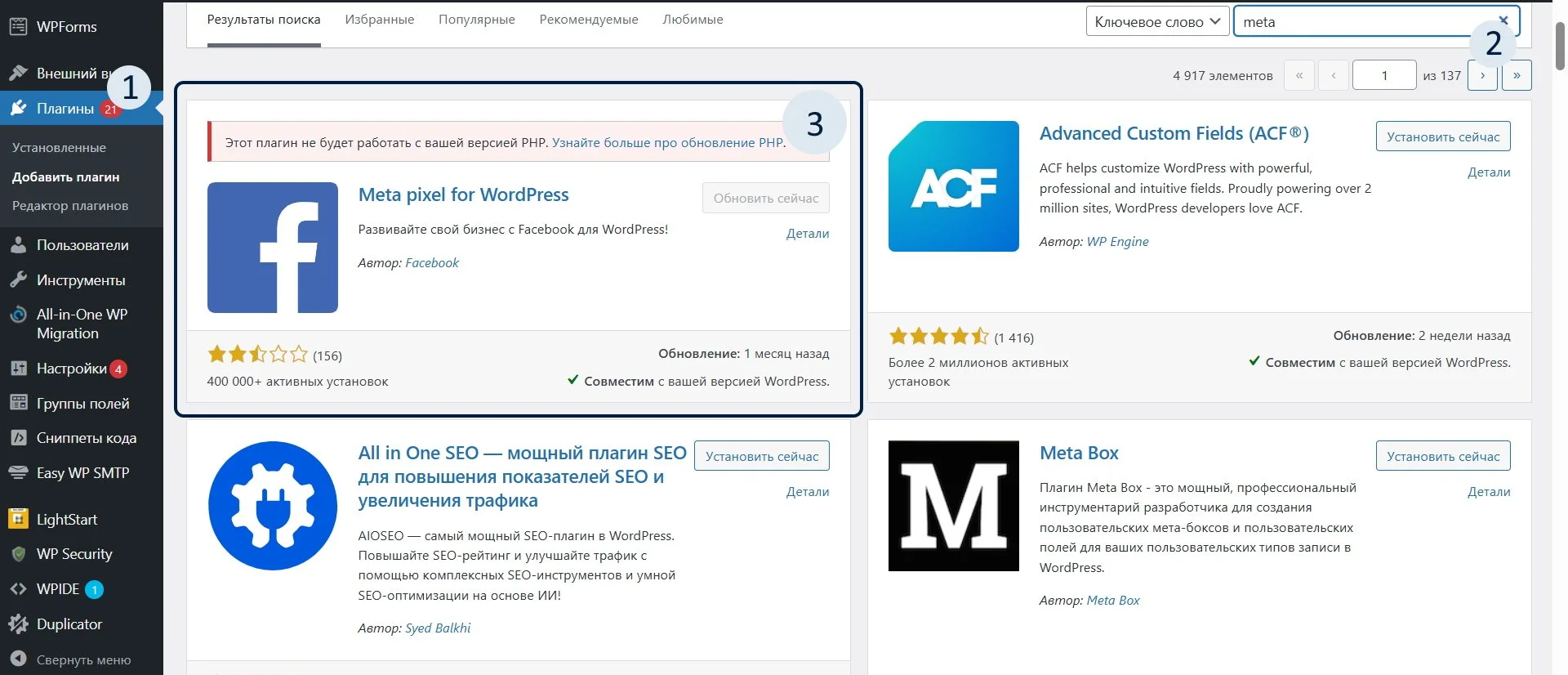Тепер треба попрацювати з самим сайтом. Перейдіть до меню «Плагіни» вашого сайту WordPress і натисніть «Додати новий». Знайдіть «Meta для WordPress». Потім встановіть та активуйте плагін.