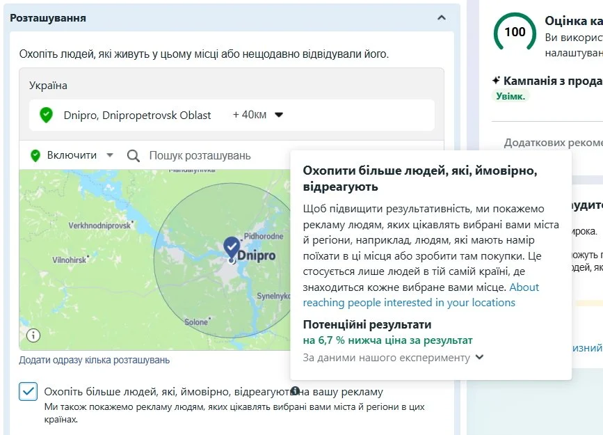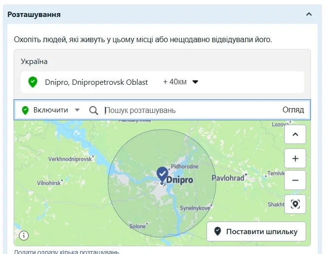 Це особливо актуально, якщо орієнтуватися на конкретне місто для просування місцевого бізнесу. Припустімо, ви хочете охопити всіх у Дніпрі. Але ось які стандартні налаштування: